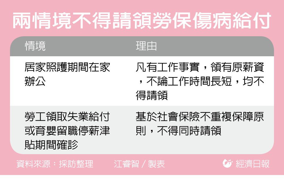 確診勞工若自願性或被要求居家上班,能請傷病給付?陳慧敏表示,傷病給付係以因傷病「不能工作四日以上」為給付要件,凡有工作事實,不論工作時間長短,均不得請領。勞工於居家照護期間「居家辦公」,因已有工作事實,其「居家辦公」之日數不得請領傷病給付。