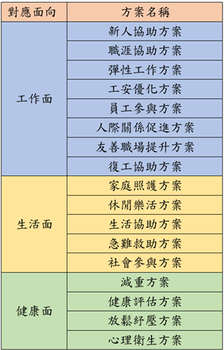 為減輕工作壓力與過勞對員工的影響,並促進職場心理健康,勞動部勞動及職業安全衛生研究所(以下簡稱勞安所)進行「我國職場心理健康及員工協助之實務分析」研究,發現企業可透過「初級介入」、「次級介入」與「三級介入」機制,針對「一般低風險對象」、「特定高風險對象」與「已有職場心理健康問題的員工」,滿足員工需求並提供預防及改善方案,以協助員工提升職場心理健康。此外,整合臺灣企業在「工作」、「生活」與「健康」三面向中,常見的員工協助方案(以下簡稱eap)有17項(如表),研究發現公司規模100人以上,較常使用「健康評估」、「新人協助」、「工安優化」、「人際關係促進」等實務方案;公司規模100 人以下較常使用「彈性工作」、「休閒樂活」、「放鬆紓壓」等方案。製造業多推動「友善職場提升」與「工安優化」方案;服務業推動「健康評估」與「新人協助」方案;科技業常使用「新人協助」及「人際關係促進」方案。