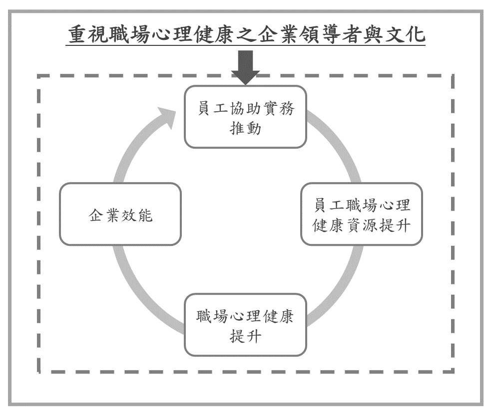 勞安所強調,對企業而言,推動eap必須與生產力連結,而eap的成功推行,必須拉近組織與員工的需求及期待,在資源有限情況下,尋求共識,提高信任,減少不滿。近年來致力於發展多種企業評估工具以供企業參考使用,包括「員工協助方案需求評估量表」、「工作生活平衡氛圍評估量表」與「職場心理健康評估量表」等,並編撰相關指導實務手冊,可提供各企業之人力資源人員、勞工安全衛生人員、職護及職場心理健康管理師使用。企業應逐步形塑職場健康文化,根據員工所缺資源,推動對應的員工協助實務,預防員工資源流失並積極提供員工所需資源,其成效不僅能提升員工之職場身心健康,長期而言,員工會回報以更積極投入工作,帶來更好工作表現,進而提高企業運作效能。(如圖)。