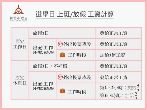 出處:中華人事主管協會 今年11月26日就是地方公職人員選舉投票日。新竹市政府今天指出,依勞動基準法規定,公職人員選舉投票日為放假日,具投票權勞工,雇主不得妨礙其投票,也製作表格宣傳說明投票日當天上班或放假者該如何計算工資,提醒勞工多加留意自身權益。