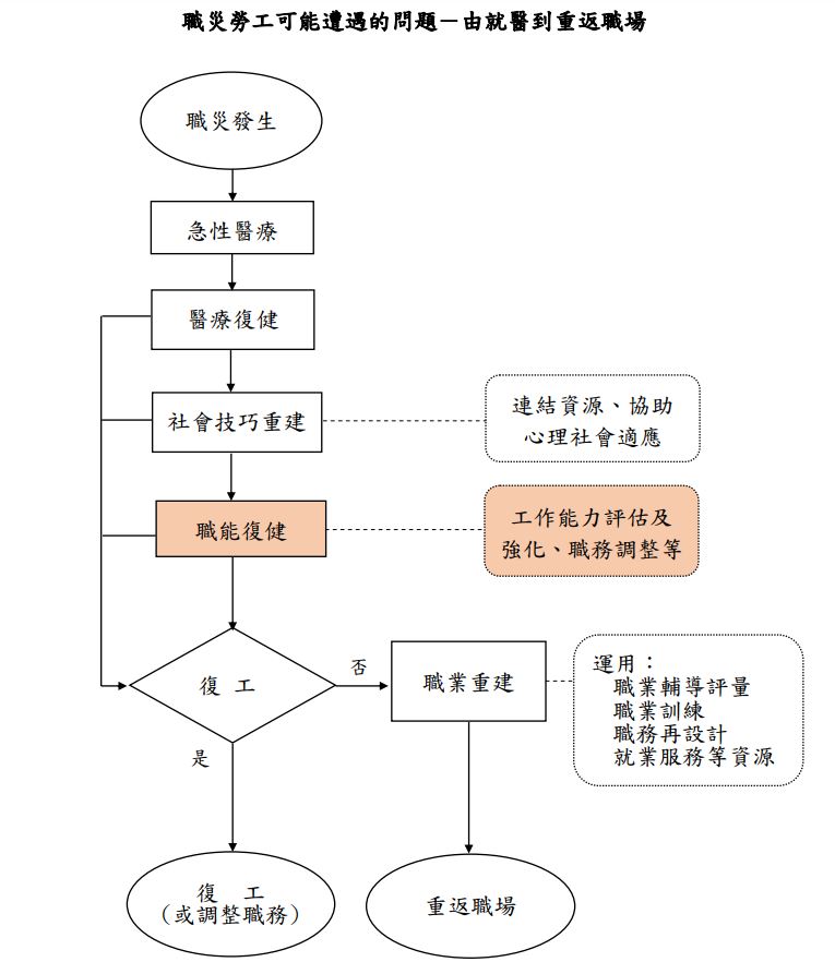 勞動部補助全臺22個專業機構提供職災勞工工作強化服務,透過專業人員的協助,讓職災勞工能儘速重返職場,減少勞工在等待或嘗試復工期間所耗費之時間、金錢、醫療及社會成本。
