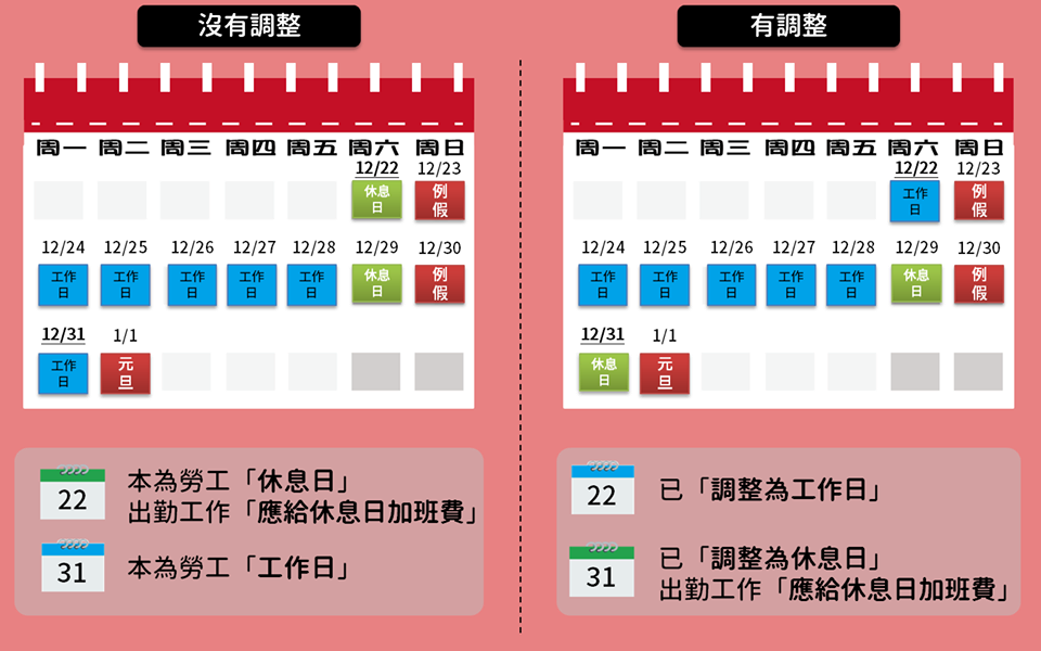 反之,若「沒有比照」政府機關辦公日曆調整出勤,22日維持為休息日,勞工不必出勤工作,31日則仍為工作日。雇主如徵得勞工在休息日工作,應給付休息日加班費。