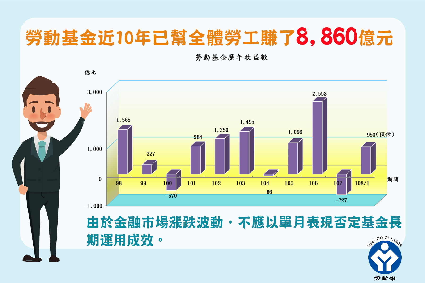 四、初步估算,勞動基金近10年平均收益率3.31%,累積已幫全體勞工賺了8,860億元。