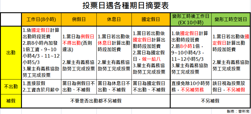 ![]() 一、投票日放假的依據我們先看勞基法的規定,投票日放假是屬於其他中央主管機關指定應放假之日。 勞動基準法一百零五年十二月六日版本(一例一休版本〉 第37條第一項:「內政部所定應放假之紀念日、節日、勞動節及其他中央主管機關指定應放假之日,均應休假。」 修法理由明確指出: 「二、另所定其他中央主管機關指定應放假之日,係指各類公職人員選舉罷免投票日,併予說明。」 以下是歷次中央主管機關針對投票日放假的函釋: 內政部民國 74 年 11 月 08 日(74)台內勞字第 357091 號函: 各類公職人員選舉罷免投票日各公民營事業單位對具有投票權員工依左列原則給假: 一 星期日或原屬休息日舉行投票,不另放假。 二 星期六或工作日舉行投票,按往例放假一日。 三 因行使選舉權、罷免權,放假日工資照給。如放假日仍須其繼續到工者,應依照勞動基準法規定,加給其該工作時間之工資,但應不妨礙其投票。 當時,是一週正常工作48小時,因此多數狀況,星期六也是工作日,函釋說得很清楚,若是本來就不用出勤,是不補假的,而若是原本的工作日,要放假,或是出勤要給加班費。 行政院勞工委員會民國 97 年 02 月 25 日勞動 2字第 0970130105 號令 核釋「總統副總統選舉罷免投票日」為依勞動基準法施行細則第二十三條規定指定應放假之日。具投票權且該日原屬工作日之勞工,放假一日;原毋須出勤者,不另給假給薪。所稱放假一日,係指自午前零時至午後十二時連續二十四小時。雇主徵得勞工同意於該日出勤者,應加給該工作時間之工資,且應不妨礙其投票。 當時的勞動基準法施行細則第二十三條,在一例一休修法後刪除,這部分規定改在現行的勞動基準法施行細則第23-1條。與前一則函釋意義不變,但明確指出放假一日的時間範圍。 勞動部民國 106 年 12 月 11 日勞動條 2字第 1060132365 號函 「...爰具投票權且該日原屬工作日之勞工,應予以放假;原毋須出勤者,不另給假給薪。所稱放假,指午前零時至午後 12 時連續 24小時。雇主徵得勞工同意於該日出勤者,應加給該工作時間之工資,且應不妨礙其投票。 二、具投票權且該日原屬勞動基準法第 36 條所定休息日或例假之勞工,本得行使投票權,爰不另給假。雇主徵得勞工同意於休息日出勤者,應依勞動基準法第 24 條規定計給工資,且應不妨礙其投票。」 這函釋是因應當時黃國昌立委罷免案,因為已有休息日,所以特別指出,若是休息日出勤,要依勞動基準法第24條的休息日加班費計算。 更新補充 這三個函釋,因107年11月8日勞動部重新解釋,將公投日納入,同步將此三函釋廢止,但原本的意義不變。 二、新話題:公投首投族投票日放假是要經由中央主管機關指定,而之前主管機關指定的是各類公職人員選舉罷免投票日,但是並未包含公投。 此次由於公投選舉人的年齡放寬自18歲起即可投票,衍生出18-20歲的公投首投族是否可以放假的議題,目前的說法是傾向應比照放假,勞動部也預告將會另出函釋。 更新 接著,勞動部正式函令出了,加上公投日,並且把前面三個函釋廢止,但整體意義是不變的。 勞動部民國 107 年 11 月 08 日勞動條 2字第 1070131393 號令 「總統副總統選舉罷免投票日、公職人員選舉罷免投票日及公民投票日」 ,依本部中華民國一百零七年十一月八日勞動條三字第一○七○一三一四 六○號公告為勞動基準法第三十七條第一項所定應放假日。 具投票權且該日原屬工作日之勞工,應予以放假一日;原毋須出勤者,不另給假給薪。所稱放假一日,指午前零時至午後十二時連續二十四小時。 雇主徵得勞工同意於該日出勤者,應加給該工作時間之工資,且應不妨礙其投票。 具投票權且該日原屬勞動基準法第三十六條所定休息日或例假之勞工,本得行使投票權,爰不另給假。雇主徵得勞工同意於休息日出勤者,應依勞動基準法第二十四條第二項規定計給工資,且應不妨礙其投票。 本解釋令自即日生效。 內政部主管勞工事務時期七十四年十一月八日(七四)台內勞字第三五七 ○九一號函、本部改制前行政院勞工委員會九十七年二月二十五日勞動二 字第○九七○一三○一○五號令及本部一百零六年十二月十一日勞動條二 字第一○六○一三二三六五號函,自即日廢止。 三、投票日放假的屬性因為投票權不能任意被剝奪,所以投票日放假的規定,主要是讓該日原本就是工作日的勞工,應該放假一日行使其投票權。 所以雇主若是要讓勞工在投票日出勤,就必須在不妨礙勞工投票的前提下,取得勞工同意於該日出勤,並要加給該工作時間之工資。 但是這天若本來就是勞工的非工作日,勞工本來就可以去投票,因此就不再另外補假了。 而因為投票權只能在當天行使,所以這天是不能和其他工作天對調的。至於未滿18歲不具投票權的勞工,及外籍勞工,因為沒有投票權,所以當日雇主可不給假,出勤也沒有加班費。 四、投票日放假時間算法上述函釋已經很清楚的指出,所謂的放假一日,是指自午前0時至午後12時連續24小時。 因此,假設是投票日凌晨0點工作到早上9點,工作8小時,雖然半夜不能去投票,但是那天有出勤,仍然要給8小時一倍的加班費。 如果是早上8點工作到下午5點,一樣工時8小時,這時若勞工要前2小時去投票,10點再上班,雇主不得妨礙,另再計算6小時加班費。 這裡要留意的是,若公司的工作時間有跨到曆日的,必須要做切割分別計