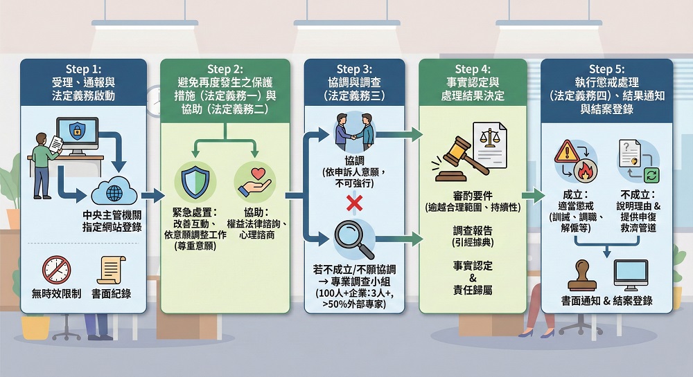 當雇主接獲職場霸凌申訴時,未來的處理重心已從單純的內部糾紛排解,提升為職安法所課予的「法定義務」。下面除了說明職場霸凌申訴處理的 5 個步驟(包含職安法修正草案四項法定義務),也會提醒在過程中容易忽略的 5 個注意事項,幫助身為雇主的您順利合規應對。